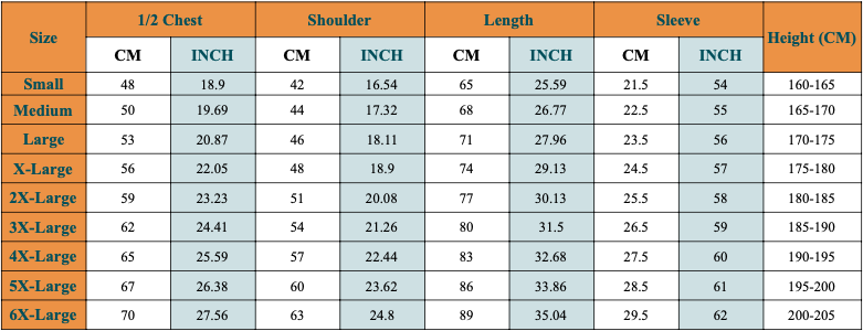 Use the chart below to find the best fit based on your chest, shoulder, length, and sleeve measurements.